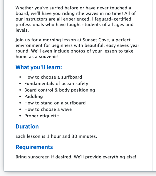 - Be concise. Let your customers know what to expect, without overwhelming them with details. Ask yourself: would I feel comfortable booking this activity with the info provided?