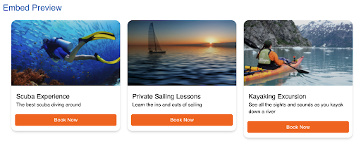 The custom embed generator is an application used to create HTML code blocks for presenting tour listings on your website. It serves a similar purpose as item embed grids generated from flows in the Dashboard, although allows for custom links that open in a Lightframe. This means we can present listings from more than one Dashboard. This is especially useful for affiliate companies, who resell items from multiple companies.