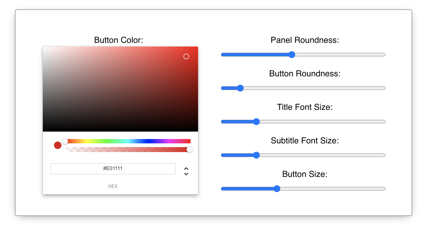 The generator allows you to further customize the look and feel of your embed. To view additional customization options click the Customize button. Here you can change the button color, button roundness, panel roundness, and size of the title and subtitle independently. Be aware that on smaller screen sizes, larger buttons or text may overlap.