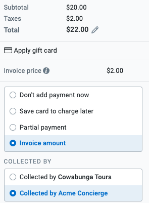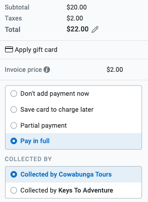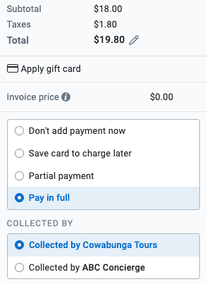 The total price is already discounted by the commission amount and can be collected by you and processed through FareHarbor. If the affiliate has a company card saved to their account, it will appear here as an option to charge.