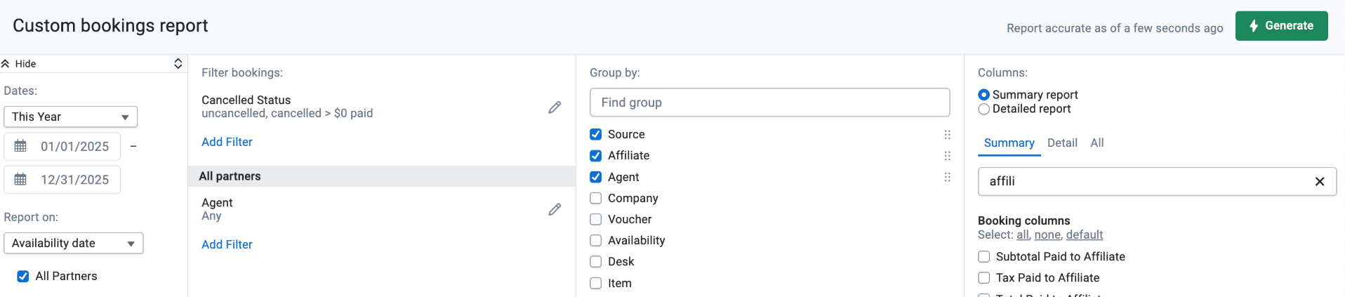 - If the Payable and Receivable columns are empty, most likely the tour operator has generated an invoice for bookings during this period. In this case, you can select and add the booking columns Paid to Affiliate and Received from Affiliate to the report for a truer picture.