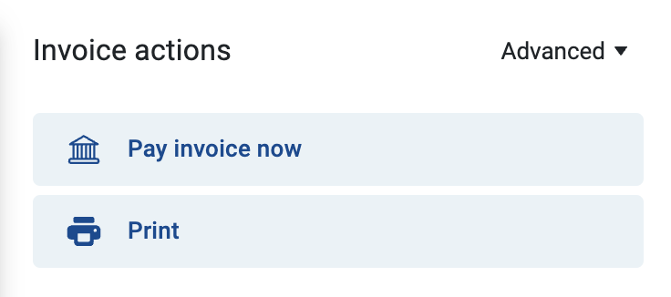 - Navigate to Invoice actions and click on Pay invoice now. This option is only visible when an associated invoice has been generated.